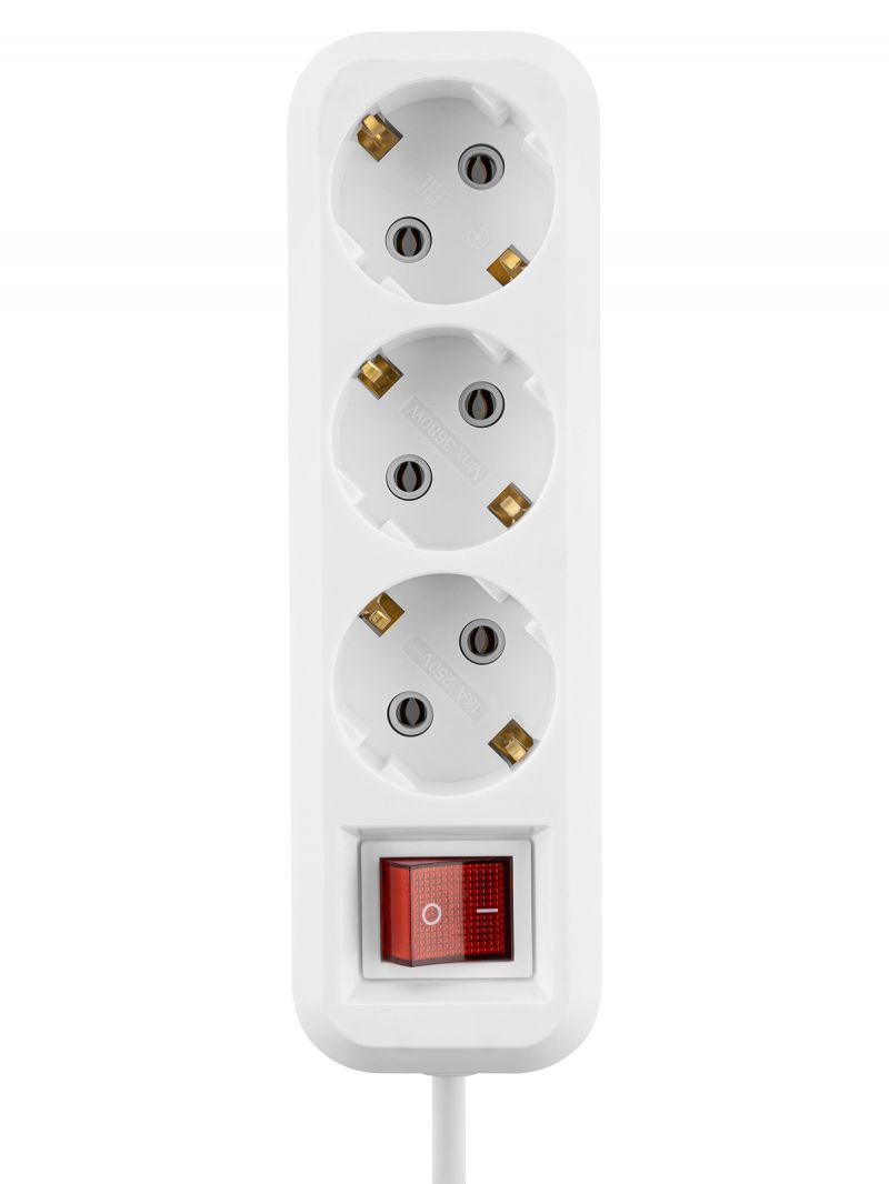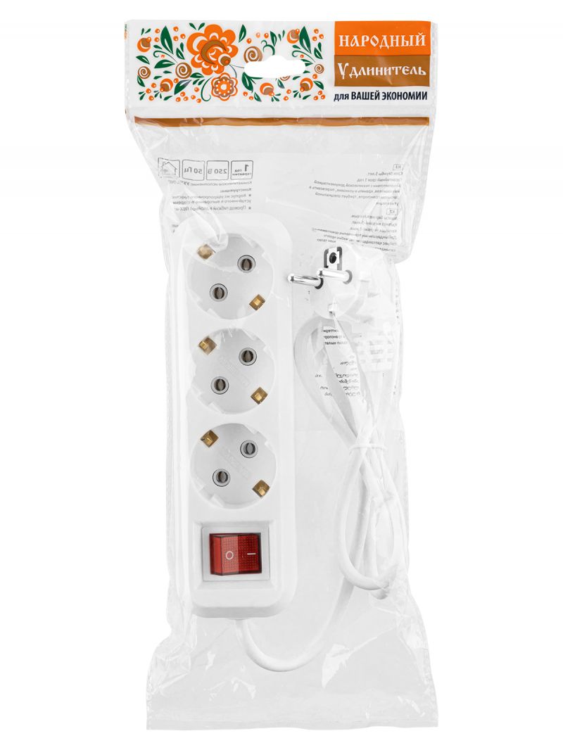 Удлинитель 3 гнезда, 1,5 метра, с/з, выкл., 10 А, 2300 Вт, белый, НАРОДНЫЙ У1-32055