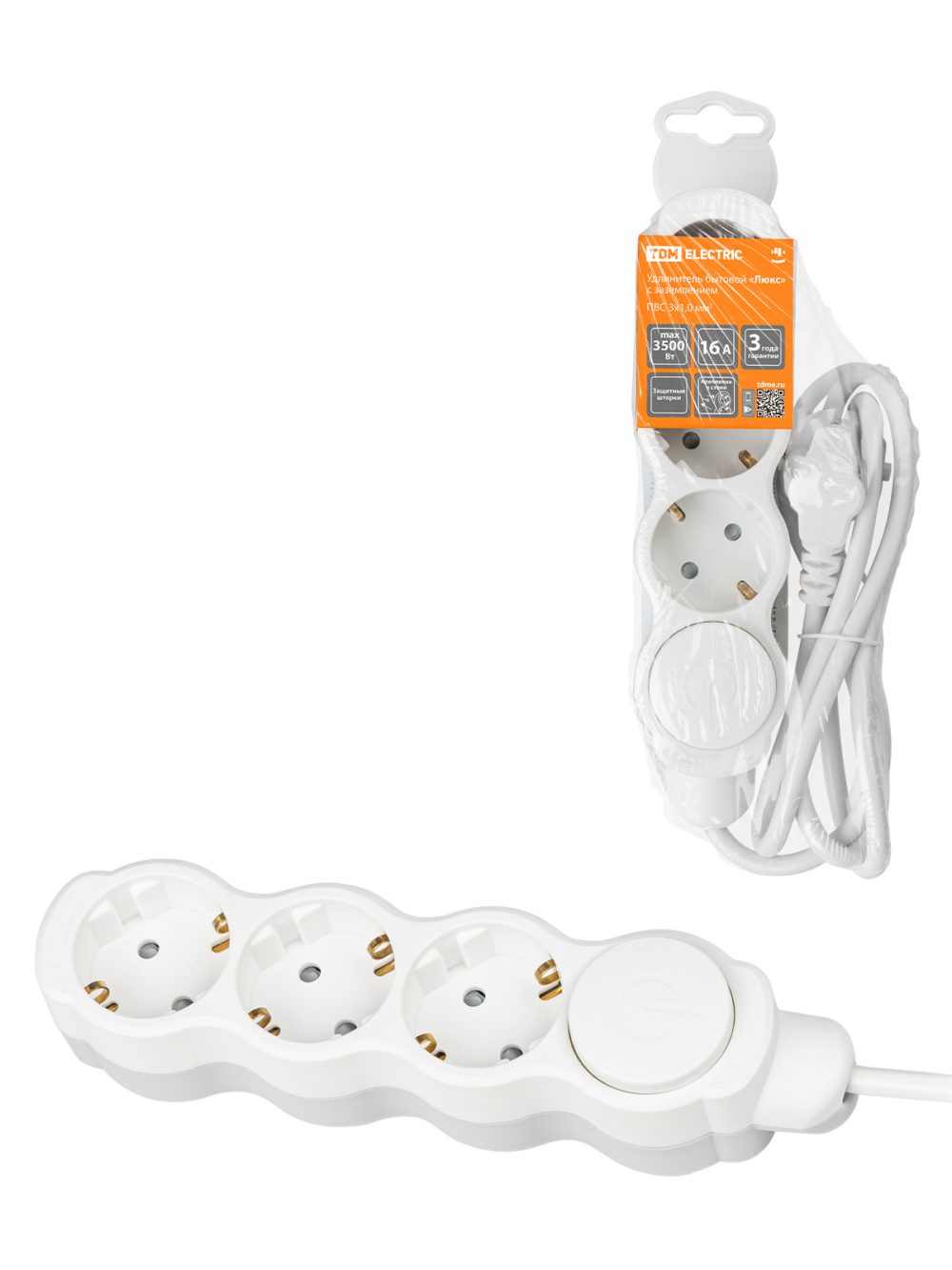Удлинитель бытовой "Люкс" с выкл., 3 гнезда, 2 м, с/з, с з/ш, ПВС 3х1 мм2, 16 А, 250 В, 3500 Вт TDM У1-33058
