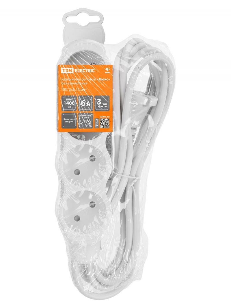 Удлинитель бытовой "Люкс" УЛ4 4 гнезда, 5м, б/з, с з/ш, ПВС 2х0,75 мм2 10А/250В бело-серый TDM