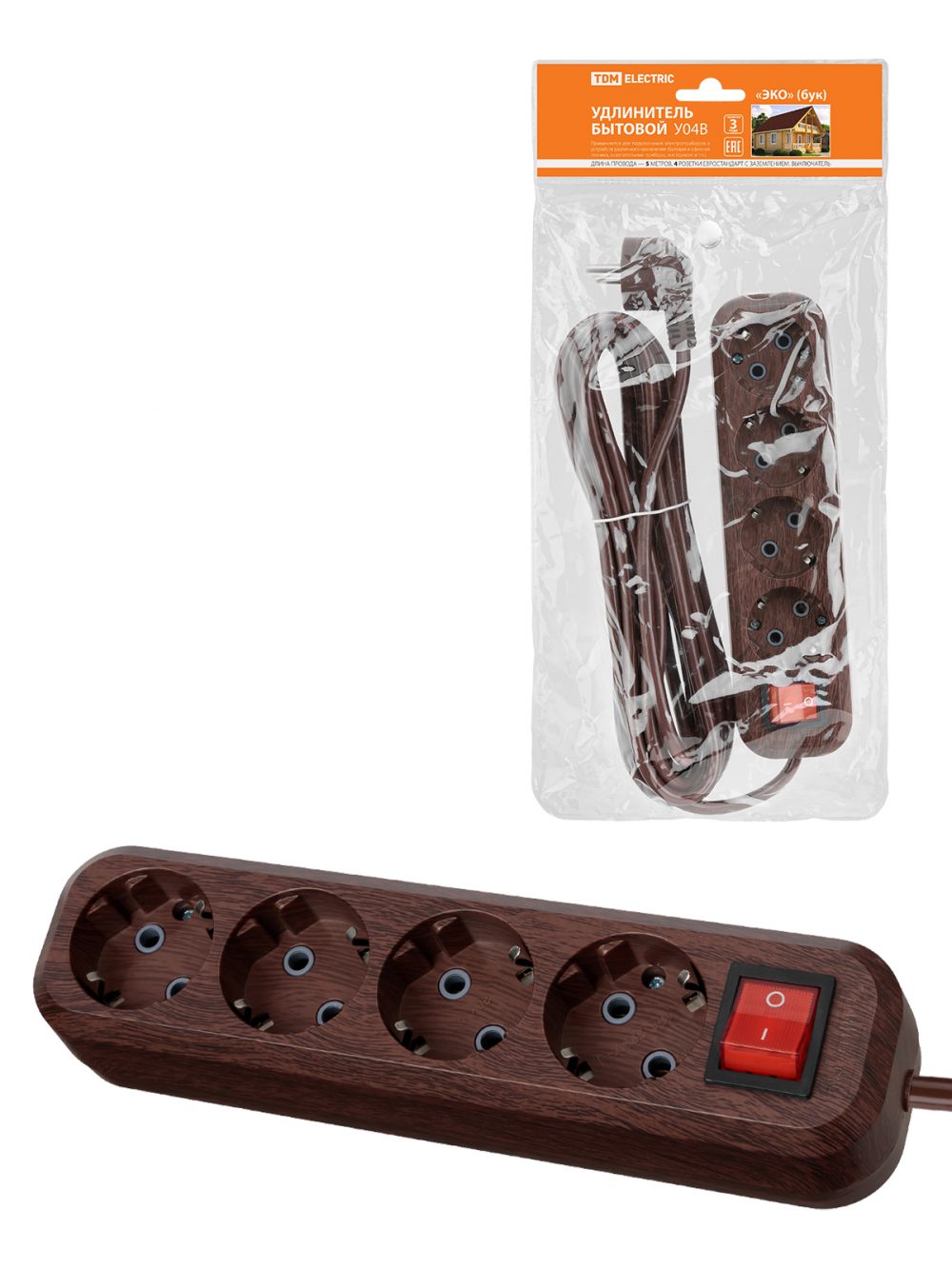 Удлинитель бытовой У04В выключатель, 4 гнезда, 5метров,2П+3, ПВС 3х1мм2 "Эко" (бук) 16А/250В TDM