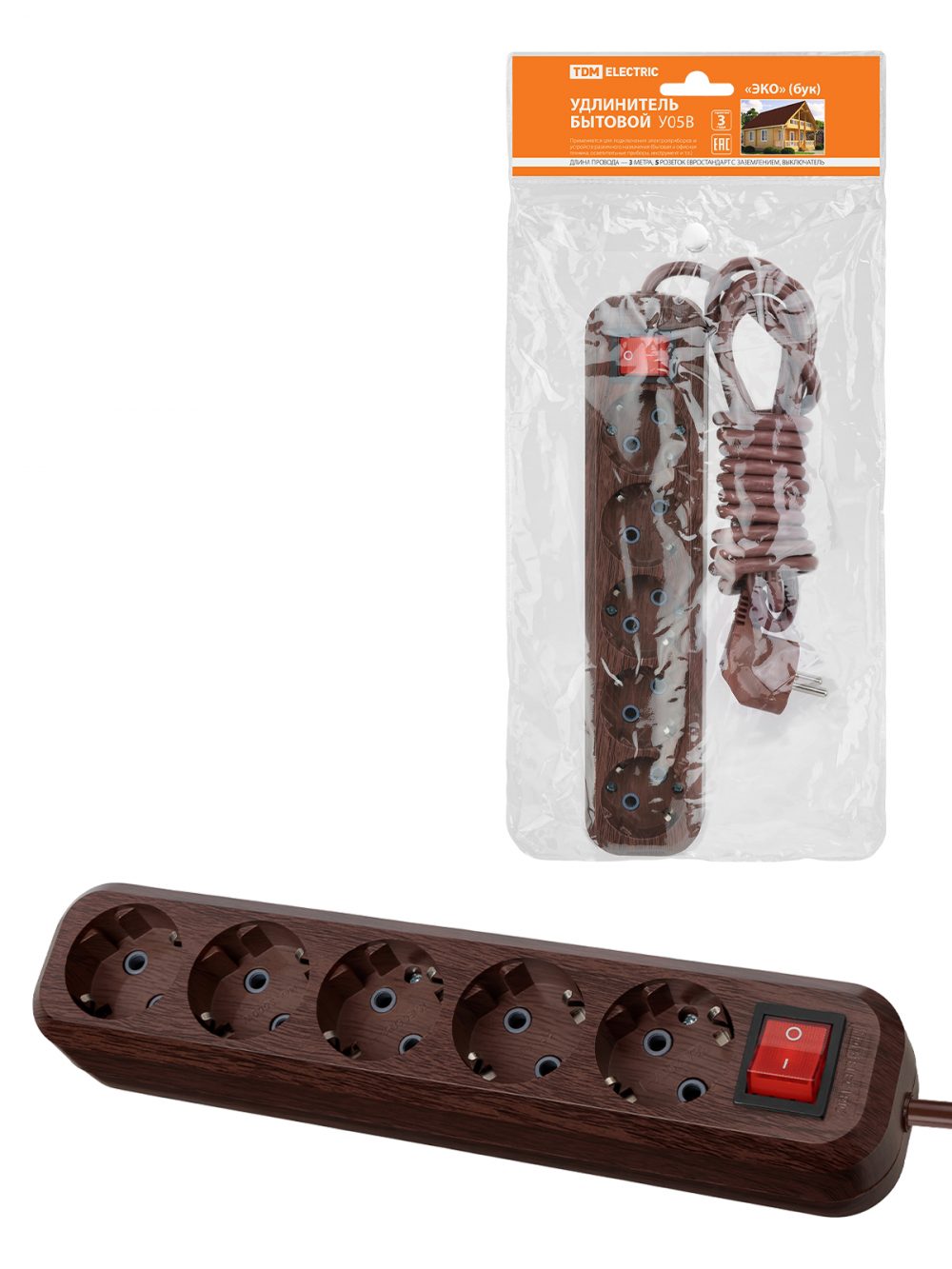 Удлинитель бытовой У05В выключатель, 5 гнезд, 3метра,2П+3, ПВС 3х1мм2 "Эко" (бук) 16А/250В TDM