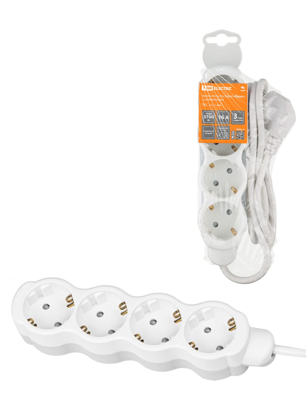 Удлинитель бытовой "Люкс" 4 гнезда, 2 м, с/з, с з/ш, ПВС 3х0,75 мм2, 10 А, 250 В, 2400 Вт TDM У1-42050