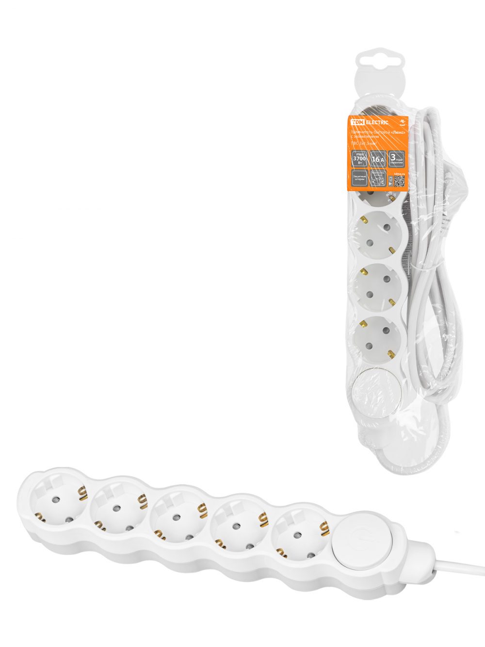 Удлинитель бытовой "Люкс" с выкл., 5 гнезд, 3 м, с/з, с з/ш, ПВС 3х1,5 мм2, 16 А, 250 В, 3700 Вт TDM У1-63223