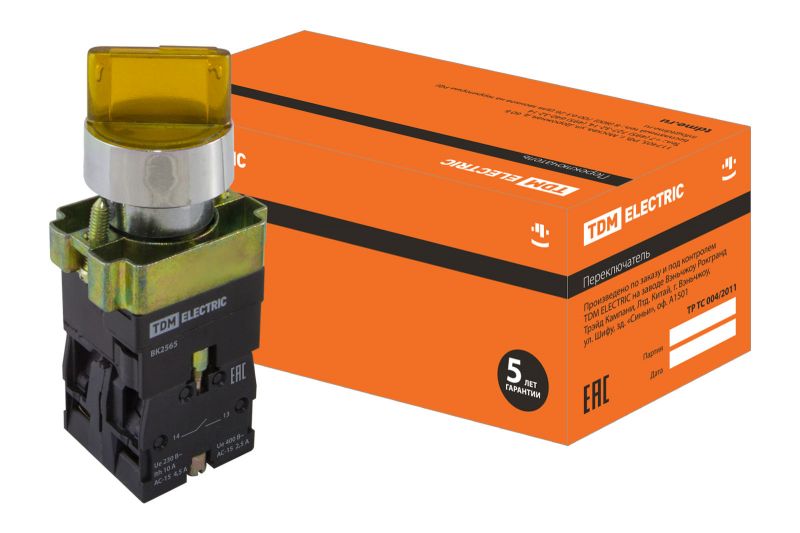 Переключатель на 3 положения с фиксацией M3SS1-21Y короткая ручка(LED) d22мм/220B 1з+1р желтый TDM