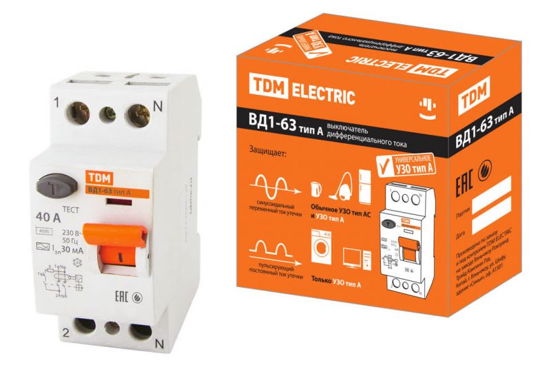 Устройство защитного отключения ВД1-63 2Р 40А 30мА тип А TDM