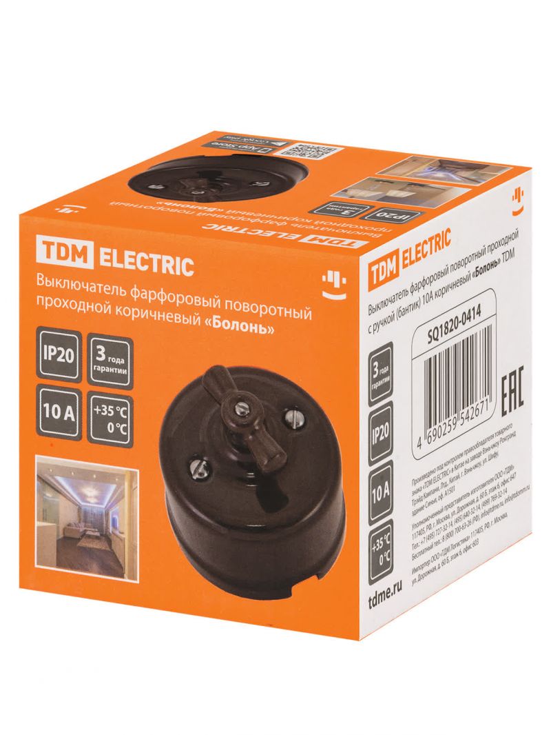 Выключатель фарфоровый поворотный проходной с ручкой (бантик) 10А коричневый «Болонь» TDM