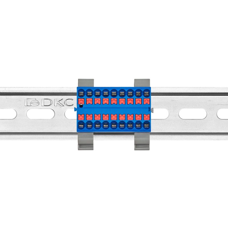 Распределительный блок с push-in зажимом и горизонтальным адаптером предназначен для быстрого и надежного распределения потенциала между несколькими цепями. Устанавливается на DIN-рейку шириной 35 мм. Оснащен 18 точками подключения с номинальным сечением 2,5 мм2, что обеспечивает гибкость при монтаже. Корпус изготовлен из прочного полиамида 6.6 с классом горючести V0 по UL-94, обеспечивая безопасность и долговечность эксплуатации. Габариты (В?Ш?Г) — 21,7?47,2?28,8 мм, цвет — синий.