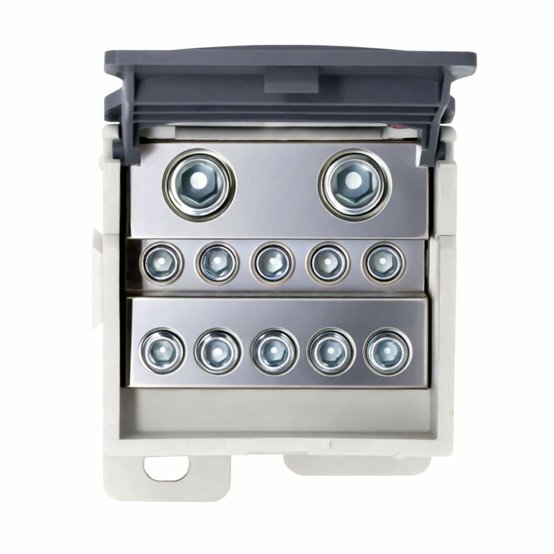 Распределительный блок POD-200 с винтовым зажимом служит для соединения и распределения многожильных или обжатых наконечником гибких проводников в электрических щитах. Установка на DIN-рейку высотой 35 мм или монтажную плату. Боковой штифт обеспечивает стыковку блоков между собой. На крышке распределительного блока нанесена ключевая информация, а также есть паз для маркировки NUTB5. В комплект входит цветная пластиковая маркировка (синий, зеленый, красный, желтый) и самоклеящаяся (L1, L2, L3, N, заземление, круг). Корпус выполнен из полиамида с классом горючести V0 UL-94. Степень защиты – IP20. Цвет – серый, 2 ввода с сечением 10-95 мм2, 10 точек подключения (выводов) с номинальным сечением проводников 2,5-16 мм2. Габариты (В?Ш?Г) – 50?50,5?67,5 мм.