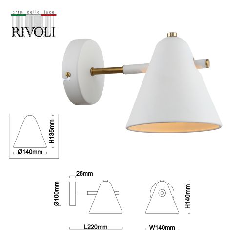 Коллекция освещения для дома и общественных пространств Rivoli Chelsea: бра под 1 лампу (арт. 3141-401), подвесной светильник под 1 лампу (арт. 3141-201), подвесной светильник под 3 лампы (3141-203), люстры потолочные под 6 и 8 ламп (артикулы 3141-306 и 3141-308). Бра настенное Rivoli Chelsea выполнено из металла, гальванизировано в белый цвет, имеет декоративные части золотого оттенка. Конусообразный плафон бра направлен вниз, что обеспечивает яркую подсветку для чтения, подсветку столешницы, подсветку прикроватной тумбы. Лампа для светильника-бра Chelsea – Е14 40 Вт. Освещаемая площадь бра – до 3 м2. Бра в стиле лофт, бра в стиле модерн Rivoli Chelsea – выбор профессиональных дизайнеров интерьеров!