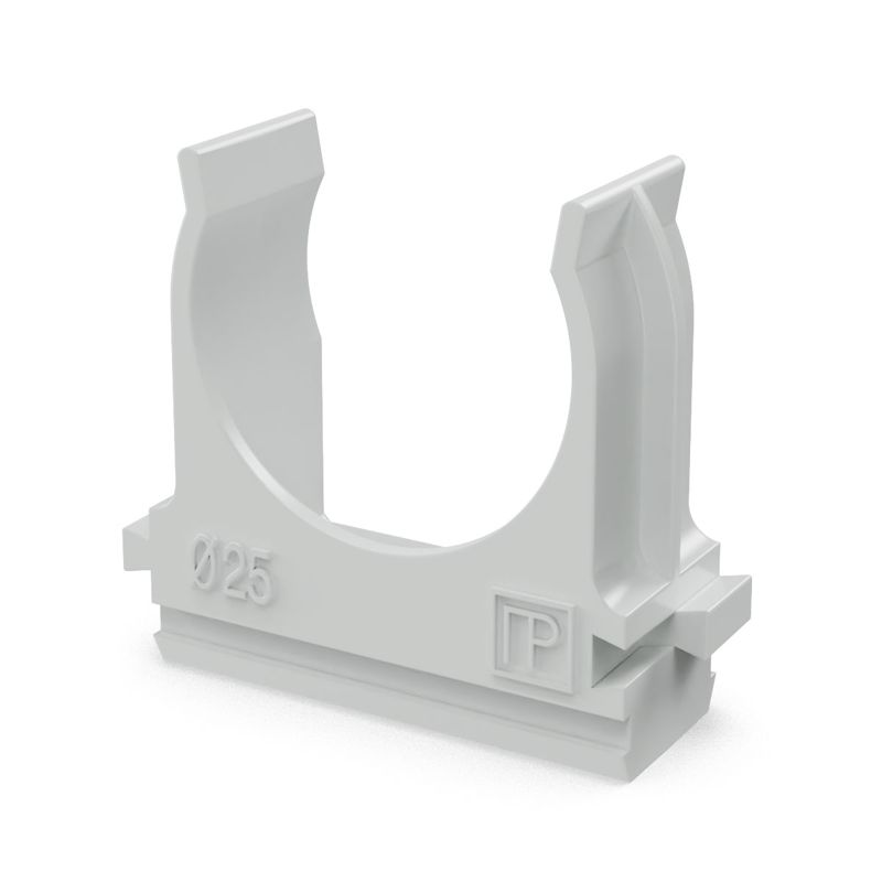 Предназначена для крепления гладких труб ПВХ или гофрированных труб одного диаметра к поверхности стен, потолков, полов или перегородок. Для монтажа предусмотрено технологическое отверстие под дюбель или саморез. Для удобства блочного монтажа состыковываются друг с другом с помощью специальных фиксаторов типа «ласточкин хвост».