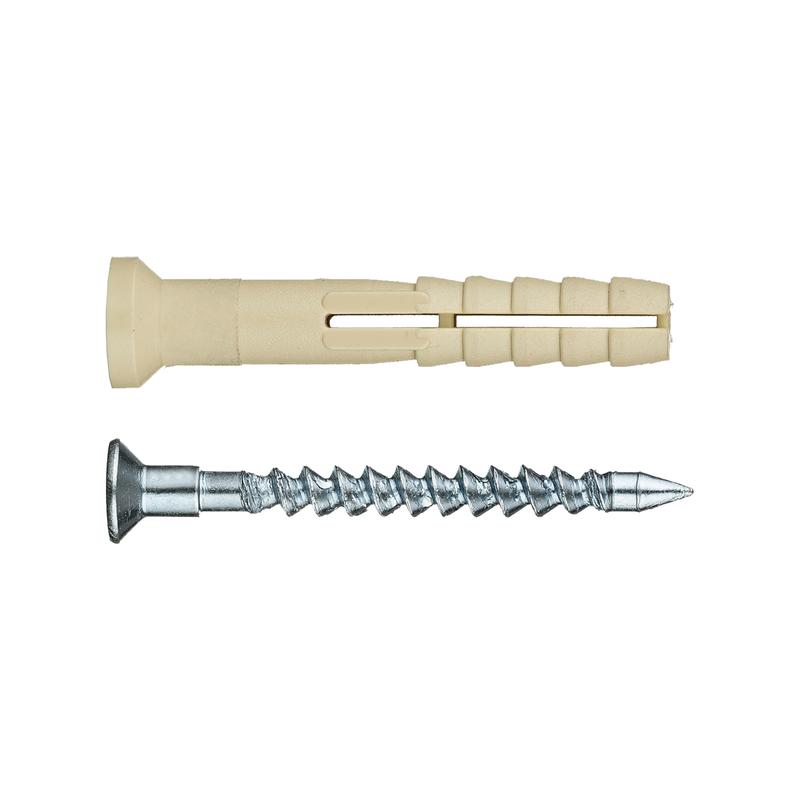 Дюбель-гвоздь SMX-L состоит из следующих элементов: дюбель с потайным бортиком и двухсегментной распорной зоной, распорный элемент – специальный гвоздь с потайной головкой с крестообразным шлицем PZ и усиленным подголовником. Дюбель изготовлен из нейлона, гвоздь – из углеродистой стали, покрытие – желтый цинк. Дюбель-гвоздь предназначен для крепления строительных материалов и изделий к основаниям из бетона, полнотелого кирпича, строительного камня. Применяется для сквозного монтажа кронштейнов, дверных коробок, оконных рам, кабельных каналов, обрешетки, гипсокартонных листов (ГКЛ), гипсоволокнистых листов (ГКЛ) и т.д. Для установки необходимо предварительно просверлить отверстие. Прочность крепежа достигается расклиниванием дюбеля в отверстии гвоздем в момент удара молотком. С помощью крестообразного шлица на головке гвоздя можно легко ослабить или усилить крепеж, демонтировать его. Дюбель-гвоздь с потайным бортиком устанавливается «заподлицо», т.е. его шляпка утапливается, благодаря чему возможно производить крепежные работы без последующего выравнивания поверхности.