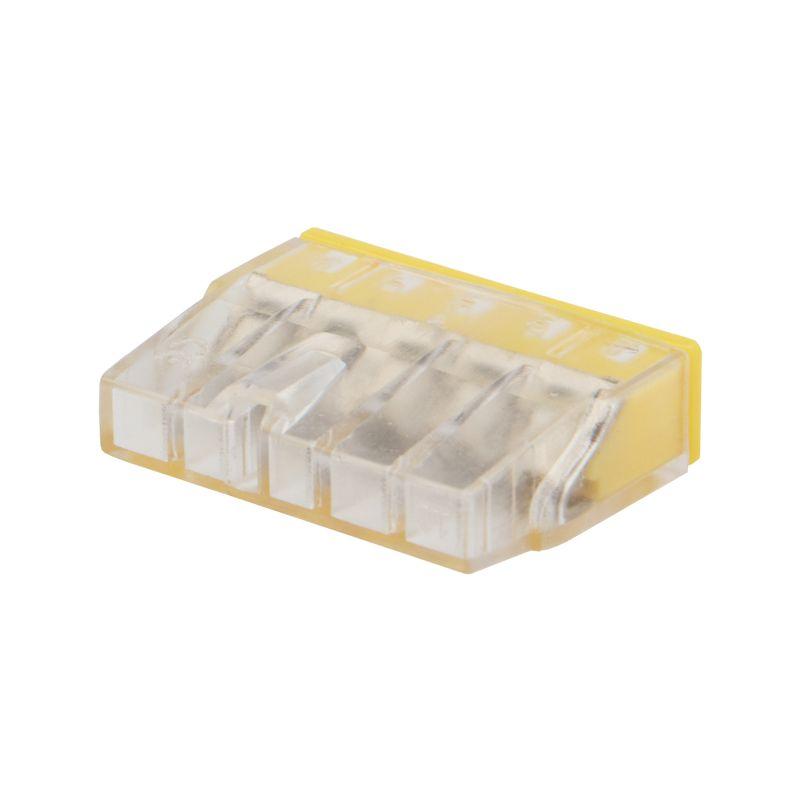 Строительно-монтажные экспресс-клеммы REXANT предназначены для подсоединения медных одножильных проводников. Они являются одним из самых быстрых, надежных и удобных способов монтажа проводников в условиях нехватки и ограничения площади. Обеспечивают экономию места до 50% по сравнению с простыми пружинными клеммами. Компактный прозрачный корпус удобен для контроля соединения, а яркая цветовая разметка способствует визуальному различию клемм по количеству проводников. Экспресс-клеммы одновременно подходят для медных и алюминиевых проводников. Прочный корпус из высококачественных материалов не поддерживает горение. Быстрый монтаж обеспечивается за счет пружинного способа соединения. Технические характеристики: Материал корпуса: полиамид 66 Контакты: луженая медь Количество контактов: 5 Цвет: прозрачный Напряжение: 450 В Ток: 24 А Поддерживаемое сечение: 5x0,2-2,5 мм2 (одножильный провод) Длина зачистки изоляции: 11 мм Рабочая температура: –40...+85 °С