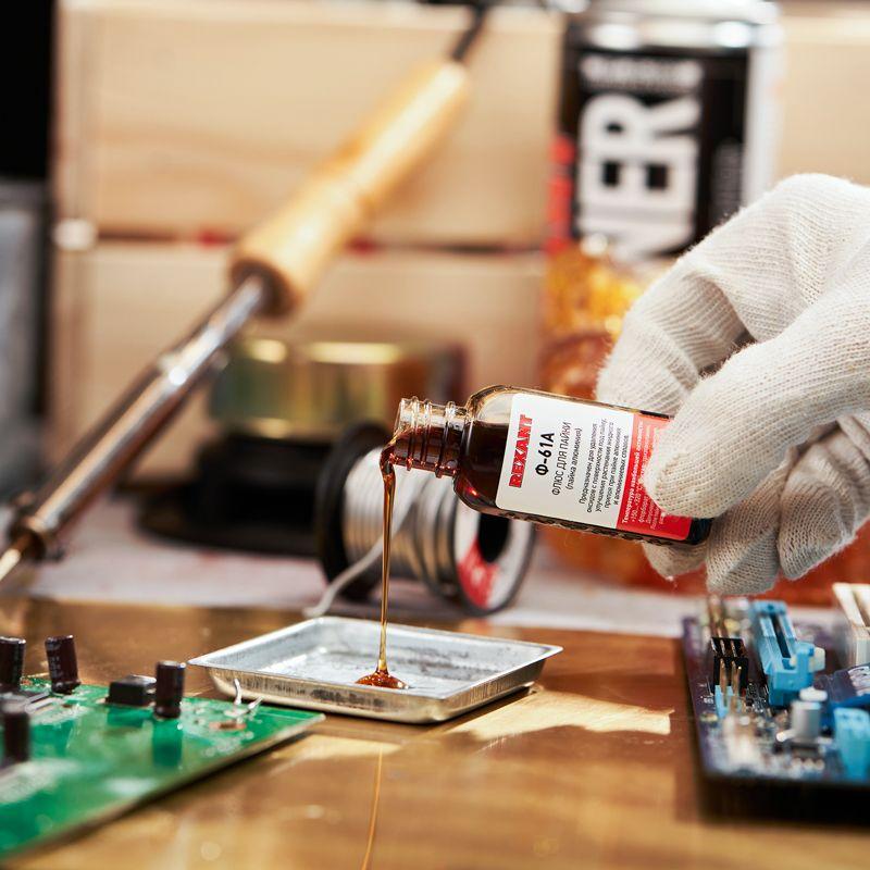 Флюс Ф-61А REXANT предназначен для удаления оксидов с поверхности под пайку и улучшения растекания жидкого припоя. Используется при пайке алюминия и алюминиевых сплавов с медью и сталью припоями на основе олова и цинка или цинка и кадмия. Является пожаро- и взрывобезопасной продукцией. Флюс изготавливается на основе фторборатов, что значительно выделяет его из всей группы соединений для пайки. После завершения пайки требуется смыть остатки кислоты водой или 5% раствором кальцинированной соды. В процессе хранения допускается выделение незначительного количества калойдных образований. Температура наибольшей активности: +150...+320°С. Основные компоненты: триэтаноламин, фторборат цинк и фторборат аммоний. Вариант фасовки – флакон объемом 30 мл.