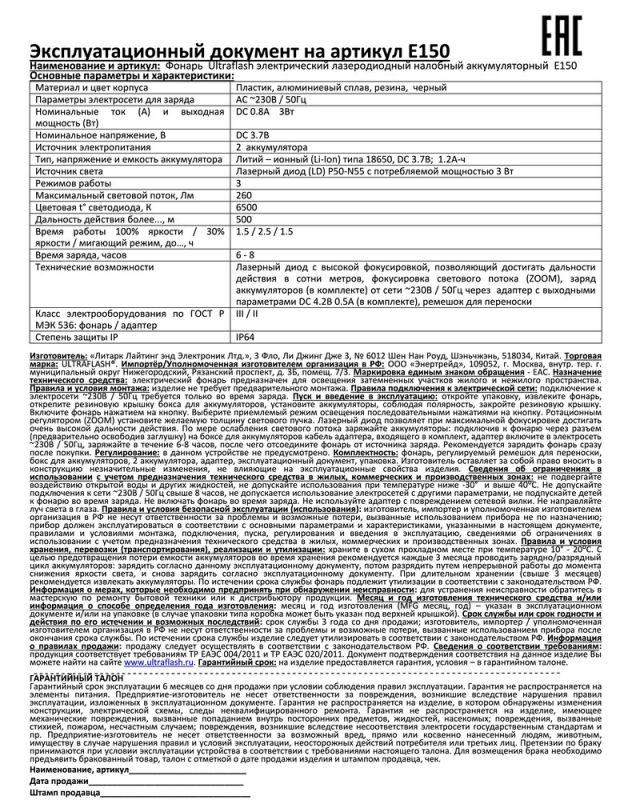 Фонарь Ultraflash электрический светодиодный налобный аккумуляторный. Цвет корпуса: черный. Материал: корпуса фонаря - алюминиевый сплав. Источник света - светодиод XML-T6 с потребляемой мощностью 3 Вт, световой поток 260 люмен. Дистанция освещения - до 150 метров. Регулируемый фокус (ZOOM). 3 режима работы -100% / 30% / мигающий. Выключатель: трехпозиционный кнопочный. Время работы при полностью заряженном аккумуляторе:: в режиме 100% - до 1,5 часов, в режиме 30% - до 2,5 часов, мигающий режим - до 1,5 часов. Время заряда 8 часов. Комплектация: фонарь, ZOOM, 2 X 18650 Li - Ion аккумулятора с напряжением DC 3,7 В емкостью по 1200 мА-ч, адаптер ~230В для заряда от электросети, поворотный отражатель, ремешок, инструкция, упаковка. Степень пыле-влаго-защиты IP64. Упаковка - пластиковый бокс. Максимальный линейный размер фонаря 10 см. Размер упаковки 6,5 см x 12 см x 20 см. Вес без упаковки 0,23 кг. Вес с упаковкой 0,360 кг.