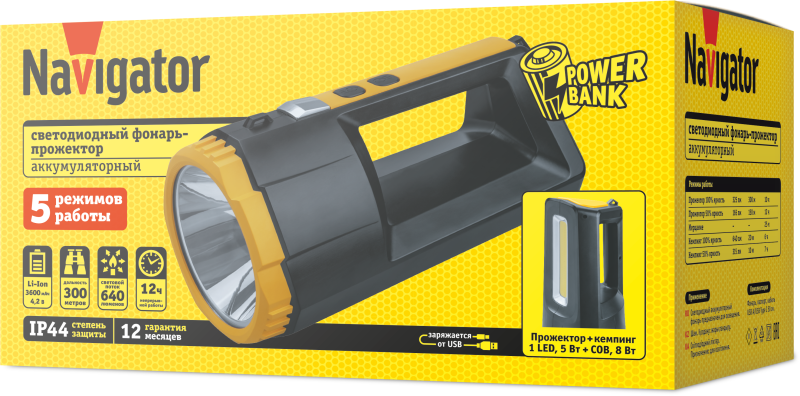 "5 режимов работы: прожектор 100% и 50% яркости, мерцание, кемпинг 100% и 50% яркости Три литий-ионных аккумулятора 1,2 мА·ч обеспечивают до 12 часов автономной работы Две кнопки управления: для режима прожектор и для режима кемпинг Кабель USB A/USB Type-C длиной 50 см поставляется в комплекте Конструкция позволяет устанавливать фонарь на поверхность горизонтально и вертикально, а также удобно держать в руке Функция Power Banк служит для подзарядки мобильных устройств Корпус из прочного АБС-пластика со степенью защиты IP44 оснащен петлями для крепления наплечного ремня"