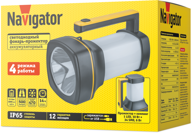 "Фонарь «2 в 1»: мощный прожектор 10 Вт + яркая лампа для кемпинга 4 режима работы: луч 100 и 50% яркости, мерцание, кемпинг Четыре литий-ионных аккумулятора 1,2 А·ч обеспечивают до 14 часов автономной работы Кабель USB A/USB Type-C длиной 50 см поставляется в комплекте Индикатор заряда на корпусе фонаря Высокая степень защиты от пыли и влаги IP65 Конструкция позволяет устанавливать фонарь на поверхность горизонтально и вертикально, а также удобно держать в руке Корпус из прочного АБС-пластика оснащен петлями для крепления наплечного ремня"