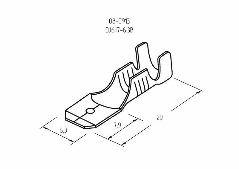 Клемма плоская (КП штекер – 6.3 мм) 0,5-1.5 мм2 (DJ617-6.3В) REXANT предназначена для создания качественного подключения электрооборудования или соединения проводов между собой, которое при необходимости возможно разъединить без лишних усилий. Такая клемма используется для оконцовывания многожильных медных проводов при монтаже мобильных электрических контактных соединений на подвижном составе (автомобиле-, вагоно-, самолето- и судостроении). Клемма плоская неизолированная (штекер) REXANT изготовлена из латуни. Обжатие производится специальными пресс-клещами (к примеру, ht-202 арт.12-3031 и 12-3032; ht-230 арт.12-3101 и 12-3001; ht-301 арт.12-3020) по жиле и по изоляции, что обеспечит максимальную прочность соединения с проводом. Размер контакта определяется шириной клеммы. Каждая клемма имеет отверстие, служащее фиксатором замкового типа с гнездовым разъемом. Основные характеристики: Температурный диапазон эксплуатации: -55...+135 ? Сечение применяемых проводов в диапазоне: 0.5-1.5 мм2 Общая длина штекера: L = 20 мм Рабочая ширина штекера: B = 6.3 мм Применение плоских клемм дает возможность существенно ускорять электромонтажные работы, при этом появляется возможность неоднократного отсоединения и присоединения проводов.