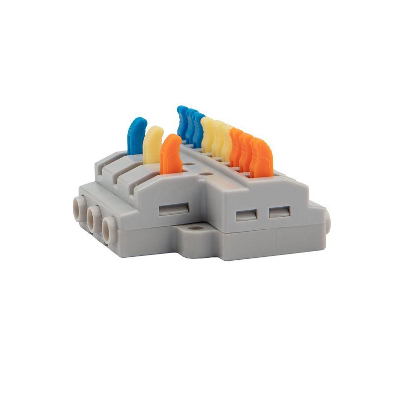 Многоразовые соединительные клеммы REXANT предназначены для соединения медных одножильных и многожильных зачищенных проводников тонкого сечения. Контакт осуществляется путем зажима проводника пластиной. Конструкция предотвращает случайное размыкание контакта. Специальное технологическое отверстие на корпусе клеммы предназначено для проверки соединения тестером-пробником или щупом мультиметра. Технические характеристики: Номинальное поперечное сечение: 4 мм2 Номинальная присоединительная способность многожильного провода: 0,08-4 мм2 Номинальный ток: 32 А Номинальное рабочее напряжение: 600 В Тип соединения: фиксатор/защелка Количество вводов: 12 Степень пылевлагозащиты: IP20 Количество в упаковке: 4 шт.