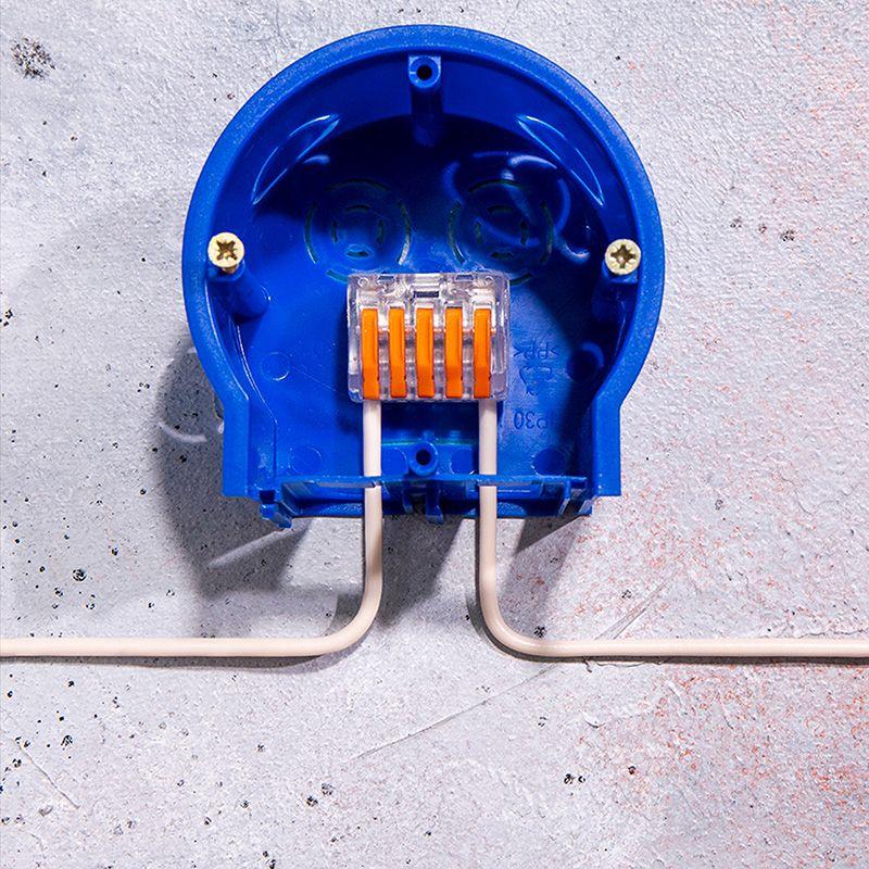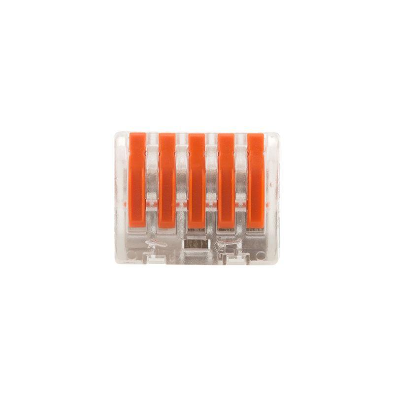 Соединительная многоразовая клемма REXANT на 5 проводников с плоско-пружинным зажимом предназначена для подсоединения медных одножильных и многожильных зачищенных проводников тонкого сечения. Перед монтажом с соединяемых проводников необходимо снять изоляцию в соответствии с обозначениями на корпусе клеммы (9-12 мм). Зачищенный участок с монтажной стороны не должен иметь сильных изгибов. Вставьте его в свободное гнездо клеммы, предварительно подняв оранжевый рычажок, после этого опустите рычажок в исходное положение. Контакт осуществляется путем зажима проводника пластиной. Конструкция предотвращает случайное размыкание контакта. Специальное технологическое отверстие на корпусе клеммы предназначено для проверки соединения тестером-пробником или щупом мультиметра. Оболочка из прозрачного пластика делает контакт изолированным, а также позволяет визуально оценить положение проводника. Извлечение проводника (демонтаж) осуществляется действиями в обратном порядке. Характеристики: Размер: 26,6x14.5x20.5 мм Материал: Полиамид 66 Количество контактов: 5 Материал контактов: луженая медь Зажим: сталь Цвет: прозрачный Напряжение: 400 В Материал подключаемых проводов: Cu Типы подключаемых проводов: одножильные, многожильные Ток: для одножильных проводов — 32 А, для многожильных проводов — 24 А\28-12 AWG Поддерживаемое сечение: 5x0.08-4 мм2 (одножильный провод), 5x0.08-2.5 мм2 (многожильный провод) Рабочая температура: –40...+85 ?C