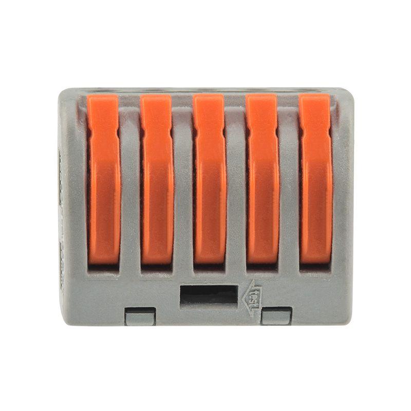 Соединительная многоразовая клемма REXANT на 5 проводников с плоско-пружинным зажимом предназначена для подсоединения медных одножильных и многожильных зачищенных проводников тонкого сечения. Перед монтажом с соединяемых проводников необходимо снять изоляцию в соответствии с обозначениями на корпусе клеммы (9-12 мм). Зачищенный участок с монтажной стороны не должен иметь сильных изгибов. Вставьте его в свободное гнездо клеммы, предварительно подняв оранжевый рычажок, после этого опустите рычажок в исходное положение. Контакт осуществляется путем зажима проводника пластиной. Конструкция предотвращает случайное размыкание контакта. Специальное технологическое отверстие на корпусе клеммы предназначено для проверки соединения тестером-пробником или щупом мультиметра. Корпус из пластика делает контакт изолированным. Извлечение проводника (демонтаж) осуществляется действиями в обратном порядке. Характеристики: Размер: 26,6x14.5x20.5 мм Материал: Полиамид 66 Количество контактов: 5 Материал контактов: луженая медь Зажим: сталь Цвет: серый Напряжение: 400 В Материал подключаемых проводов: Cu Типы подключаемых проводов: одножильные, многожильные Ток: для одножильных проводов — 32 А, для многожильных проводов — 24 А\28-12 AWG Поддерживаемое сечение: 5x0.2-4 мм2 (одножильный провод), 5x0.14-2.5 мм2 (многожильный провод) Рабочая температура: –40...+85 ?C