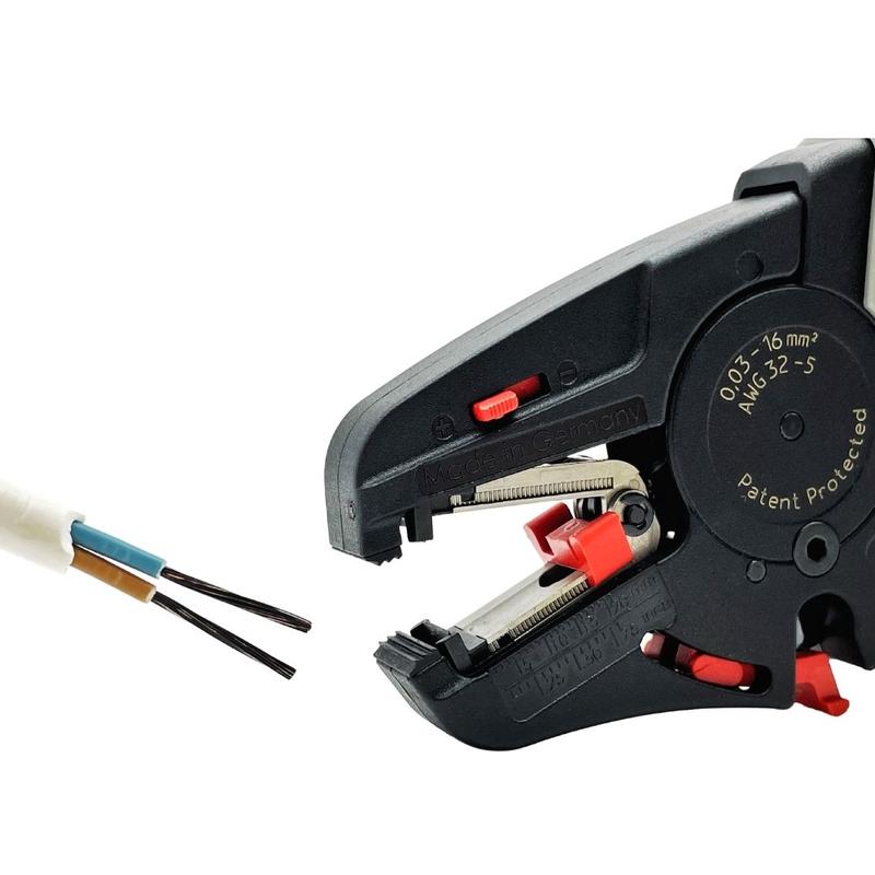 Инструмент для снятия изоляции FELO 58320040 предназначен для снятия защитных оболочек с различных видов круглых и плоских кабелей. Рукоятки и корпус инструмента изготовлены из армированного стекловолокном пластика, обеспечивающего продолжительность эксплуатации. Точный пружинный механизм обеспечивает легкость хода рукояток при работе. Стриппер полностью автоматический и не требует дополнительных настроек при работе. Предусмотрена возможность работы с одножильными и многожильными кабелями с сечением от 0,03 до 16 кв. мм. Инструмент имеет регулировку по длине зачистки кабеля до 20 мм. Так же дополнительный механизм позволяет отрегулировать силу примыкания ножей инструмента при работе с кабелями с мягкой изоляцией. Отрезной нож находится снизу и закрывается предохранительной планкой, что исключает незапланированный контакт с кабелями при работе. Стриппер имеет съёмные ножи, можно использовать ножи круглого и V-образного сечения. Приобретаются, как отдельные позиции.