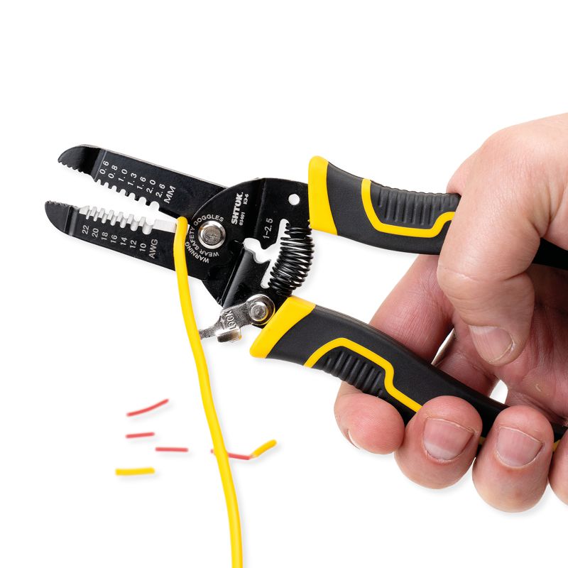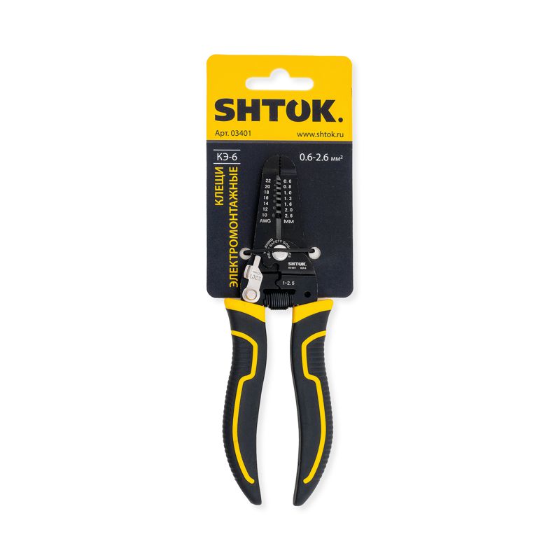 Электромонтажные клещи SHTOK КЭ-6 03401 служат для снятия изоляции с проводов без повреждения жилы, а также для их отрезания. Инструмент обладает губками и высокопрочной стали, стойкой к нагрузкам. Возвратная пружина снижает усилие во время резки кабеля. Благодаря фиксатору ручек, клещи можно компактно и безопасно хранить. Для резки проводов сечением до 6 кв.мм. Для снятия изоляции с проводов 0.6-2.6 кв.мм. Авторазжим Фиксация в закрытом положении Рукоятки PP + TPR (!) Только для резки медного многожильного провода (!) Запрещается резка стальной проволоки и струны (!) Не предназначены для работ под действующим напряжением