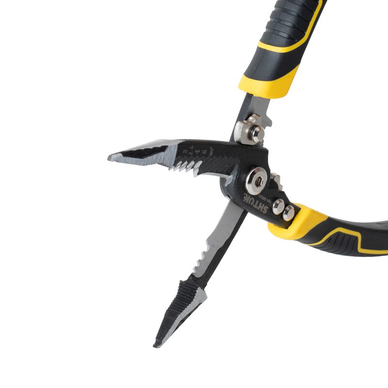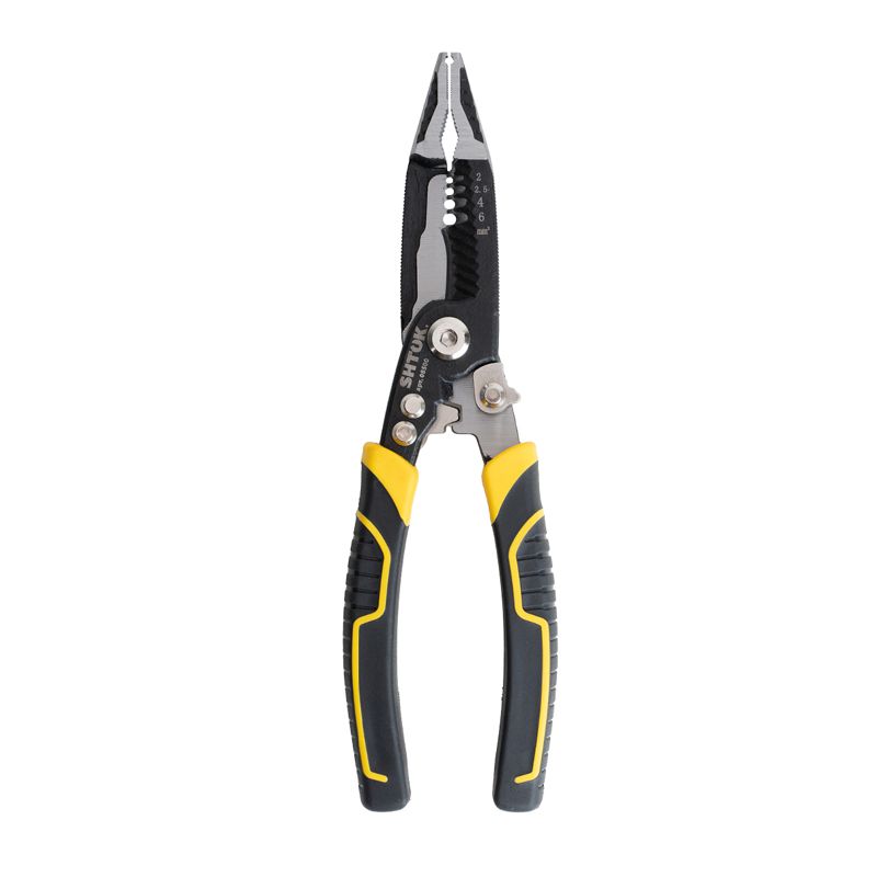 Многофункциональные электромонтажные клещи 6-в-1 предназначены для широкого спектра электромонтажных и слесарных работ: Удержание плоских и круглых предметов Монтаж / демонтаж крепежа Гибка деталей Снятие изоляции, сечение мм2: 1/1.5/2,5/4-6 Резка, диаметр мм: 24 Опрессовка неизолированных наконечников, сечение мм2: 0,5-2 Авторазжим Фиксация в закрытом положении Рукоятки PP + TPR Твёрдость режущей части HRC: 58-62 Твёрдость корпуса HRC: 46 Фосфатированное покрытие Сталь марки 55 Внимание! Только для резки медного многожильного провода. Запрещается резка стальной проволоки и струны. Не предназначены для работ под действующим напряжением."