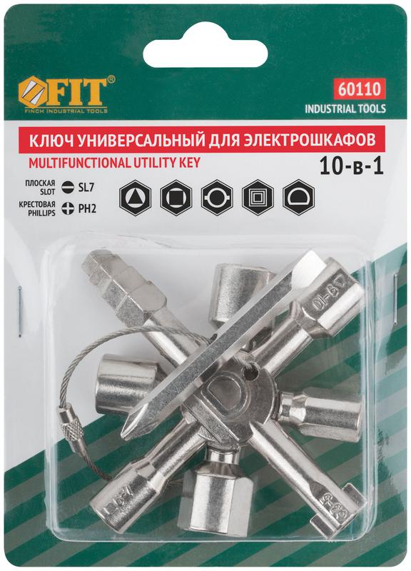 Ключ универсальный для электрошкафов FIT IT 10-в-1 предназначен для открытия электрических и сантехнических шкафов в коммуникациях зданий и транспорта, а также в системах рециркуляции воздуха. Имеет 10 наиболее распространенных форм ключей. Встроенный паз с магнитом позволяет фиксировать биту. Ключ изготовлен из цинкового сплава и обладает длительным сроком службы. Никелевое покрытие предотвращает коррозию. Компактный размер ключа дает возможность носить его в кармане.