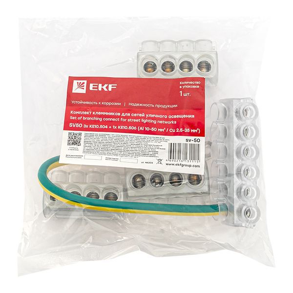 Набор клеммников уличного освещения типа sv-50 предназначен для соединения и разветвления 4-х или 6-и жильных кабелей внутри стоек или щитов опор и мачт уличного освещения. Подходит для медных и алюминиевых проводов. При подключении проводов необходимо зачистить концы от изоляции. Контакт с зачищенным проводом обеспечивается прижимными винтами с внутренним шестигранником. На проводящие части нанесена контактная смазка. Корпус клеммника неразборный. В комплект входит:ke-10.504 3 шт., ke-10.506 1 шт., заземляющий проводник 1шт.