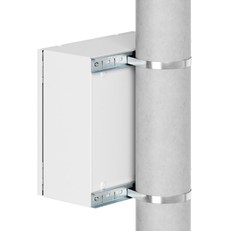 Комплект для крепления корпусов ST, STX, STE, STEX, STH, SDE, RAM box шириной 300 мм на опору. Крепежные профили изготавливаются из оцинкованной стали толщиной 2 мм, стяжные хомуты – из нержавеющей стали AISI 304. Максимальная статическая нагрузка на 2 профиля – 300 кг, подходят для круглых опор диаметром 40...195 мм или квадратных опор со стороной 60...165 мм. В комплект поставки входят: 2 профиля, 2 стяжных хомута, 2 замка для фиксации хомутов.
