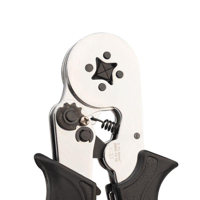 Кримпер HT-864 предназначен для опрессовки штыревых наконечников сечением 0,25–6 мм2. Корпус кримпера изготовлен из высокопрочной закаленной инструментальной стали с хромированием, что обеспечивает длительный срок службы и устойчивость к механическим нагрузкам. Четырехсегментная саморегулирующаяся матрица с системой поворотных кулачков диафрагменного типа выполняет квадратный профиль обжима с рифлением, обеспечивая равномерное распределение силы обжима. Регулятор давления позволяет настроить оптимальное усилие обжима для разных типов клемм. Возвратный механизм автоматически возвращает ручки в исходное положение после каждого цикла обжима. Храповой механизм обеспечивает качественную опрессовку без преждевременного разжатия ручек. Нескользящие рукоятки выполнены из плотного синтетического материала, что делает работу комфортной и безопасной даже при длительном использовании.
