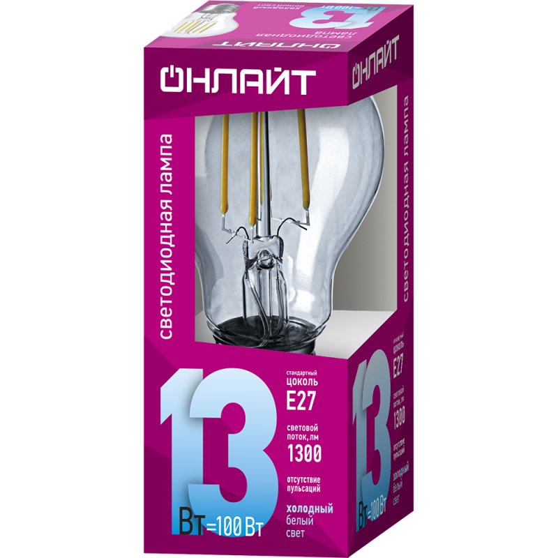 Лампа светодиодная филаментная 80 877 OLL-F-A60-13-230-4K-E27 13Вт грушевидная прозрачная 4000К нейтр. бел. E27 1300лм 220-240В ОНЛАЙТ 80877