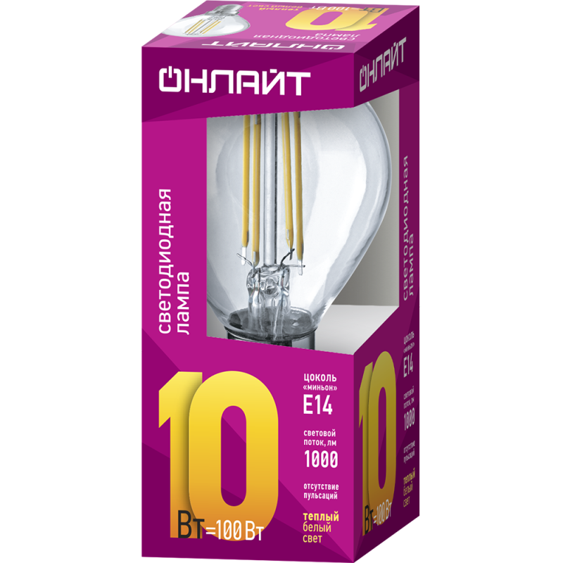 Лампа светодиодная филаментная 80 888 OLL-F-G45-10-230-2.7K-E14 10Вт шар прозрачная 2700К тепл. бел. E14 1000лм 220-240В ОНЛАЙТ 80888