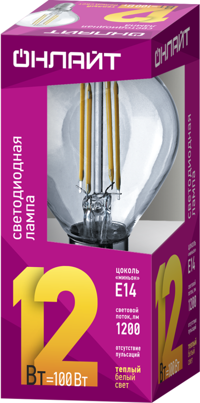Лампа светодиодная филаментная 80 890 OLL-F-G45-12-230-2.7K-E14 12Вт шар прозрачная 2700К тепл. бел. E14 1200лм 220-240В ОНЛАЙТ 80890