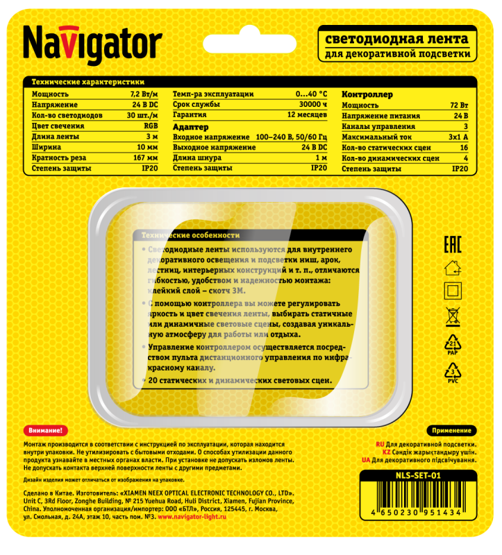 "Набор светодиодной ленты RGB с контроллером и адаптером Navigator NLS-SET – это готовое решение для внутреннего декоративного освещения вашего дома! Вам ничего не нужно приобретать дополнительно, подключите ленту Navigator и управляйте освещением с помощью пульта ДУ. Лента отличается гибкостью, надежностью и простотой монтажа, может использоваться для подсветки ниш, арок, лестниц, интерьерных конструкций и т. п. • В комплекте: светодиодная лента, адаптер, IR-контроллер с пультом ДУ и монтажный набор • Адаптер имеет компактные размеры, для монтажа ленты не понадобится много места • Длина шнура адаптера 1 метр • Цвет свечения ленты RGB • С помощью контроллера вы можете регулировать яркость и цвет свечения ленты, выбирать статичные или динамичные световые сцены • 16 статических световых сцен; 4 динамические световые сцены • Дистанционное управление по ИК-каналу • Надежный монтаж на скотч 3М"