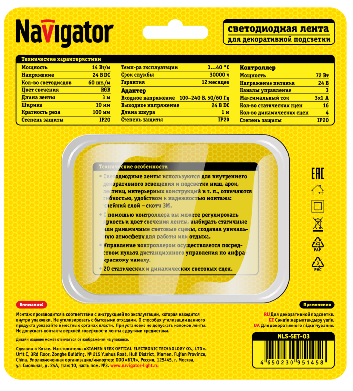 "Набор светодиодной ленты RGB с контроллером и адаптером Navigator NLS-SET – это готовое решение для внутреннего декоративного освещения вашего дома! Вам ничего не нужно приобретать дополнительно, подключите ленту Navigator и управляйте освещением с помощью пульта ДУ. Лента отличается гибкостью, надежностью и простотой монтажа, может использоваться для подсветки ниш, арок, лестниц, интерьерных конструкций и т. п. • В комплекте: светодиодная лента, адаптер, IR-контроллер с пультом ДУ и монтажный набор • Адаптер имеет компактные размеры, для монтажа ленты не понадобится много места • Длина шнура адаптера 1 метр • Цвет свечения ленты RGB • С помощью контроллера вы можете регулировать яркость и цвет свечения ленты, выбирать статичные или динамичные световые сцены • 16 статических световых сцен; 4 динамические световые сцены • Дистанционное управление по ИК-каналу • Надежный монтаж на скотч 3М"