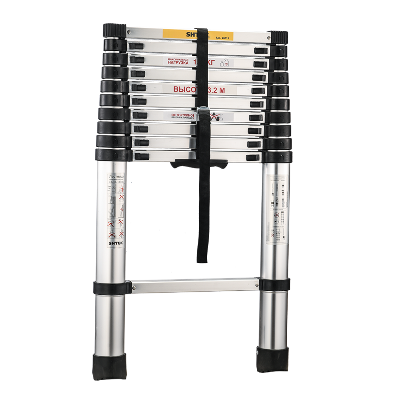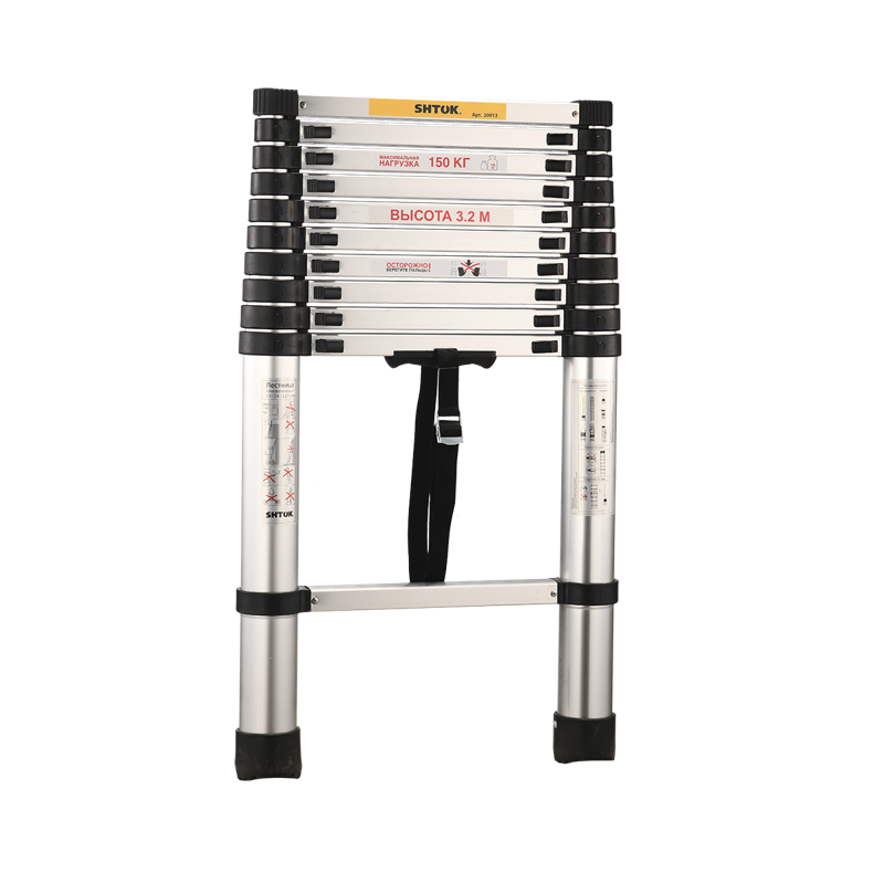 Телескопическая лестница SHTOK 3.2м 20013 выдерживает нагрузку до 150 кг за счет конструкции, выполненной из дюралюминия и первичного пластика. На стенде испытываемая лестница выдерживает 10 000 циклов на раскрытие-закрытие. Особенности SHTOK 20003 20013 Прочность Лестница изготовлена из дюралюминия и первичного (непереработанного) пластика. Удобство транспортировки и хранения В сложенном состоянии телескопическая лестница удобна в транспортировке и хранении.
