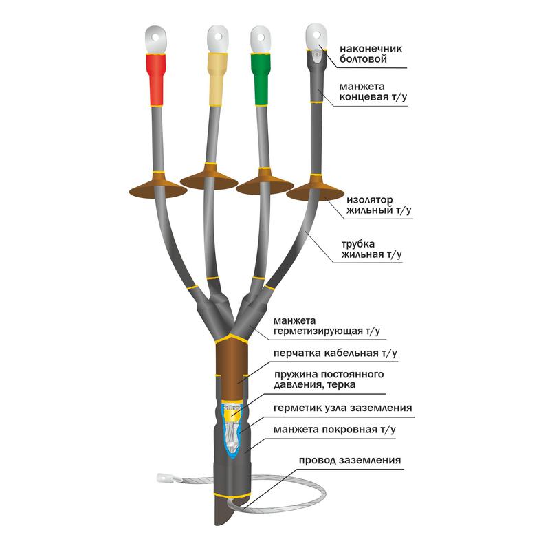 Муфта кабельная концевая марки 1КНТпН-4х(35-50) с болтовыми наконечниками наружной установки предназначена для оконцевания 4-х жильных силовых кабелей сечением 35, 50 кв.мм с бумажной или пластмассовой изоляцией, с броней или без брони, на напряжение до 1 кВ включительно. Устанавливается на открытом воздухе. Эксплуатируется при температуре окружающей среды от -50°C до +50°C и относительной влажности до 98%. Соответствует требованиям ГОСТ 34839-2022 и ТУ 3599-012-31930690-2016. Прошла необходимый комплекс независимых испытаний в аккредитованных лабораториях, на основании которых выданы сертификаты соответствия требованиям ГОСТ, ТУ, пожарной и экологической безопасности. Монтируется на разделке кабеля путем термоусаживания деталей из модифицированного полимера с помощью газовой горелки или высокотемпературного фена. Универсальные болтовые наконечники со срывными головками, входящие в комплект кабельной муфты, подходят для кабелей как с алюминиевыми, так и с медными жилами. Комбинированный комплект заземления предусматривает крепление провода заземления к металлической оболочке кабеля с применением роликовой пружины постоянного давления и контактной терки, а к бронелентам - методом пайки. Обладает устойчивостью к ультрафиолетовому излучению и воздействию погодно-климатических факторов. Сочетает простоту монтажа и высокую эксплуатационную надежность. Срок службы - не менее 30 лет.