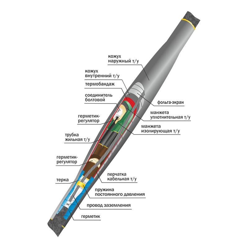 Муфта кабельная соединительная марки 10СТп(тк)-3х(150-240) с болтовыми соединителями предназначена для соединения 3-х жильных силовых кабелей сечением 150, 185, 240 кв.мм с бумажной пропитанной изоляцией, с броней или без брони, на напряжение до 10 кВ включительно. Устанавливается непосредственно в грунте, а также в тоннелях, каналах, коллекторах и других кабельных сооружениях без ограничения по уровню прокладки. Эксплуатируется при температуре окружающей среды от -50°C до +50°C и относительной влажности до 98%. Соответствует требованиям ГОСТ 34839-2022 и ТУ 3599-012-31930690-2016. Прошла комплекс независимых испытаний в аккредитованных лабораториях, на основании которых выданы сертификаты соответствия требованиям ГОСТ, ТУ, пожарной и экологической безопасности. Монтируется на двух концах соединяемых кабелей путем термоусаживания деталей из модифицированного полимера с помощью газовой горелки или высокотемпературного фена. Универсальные болтовые соединители со срывными головками, входящие в комплект кабельной муфты, подходят для кабелей как с алюминиевыми, так и с медными жилами. Комбинированный комплект заземления предусматривает крепление провода заземления к металлическим оболочкам соединяемых кабелей с применением роликовых пружин постоянного давления и контактных терок, а к бронелентам - методом пайки. Обладает необходимым уровнем устойчивости к воздействию агрессивных внешних факторов. Сочетает простоту монтажа и высокую эксплуатационную надежность. Срок службы - не менее 30 лет.
