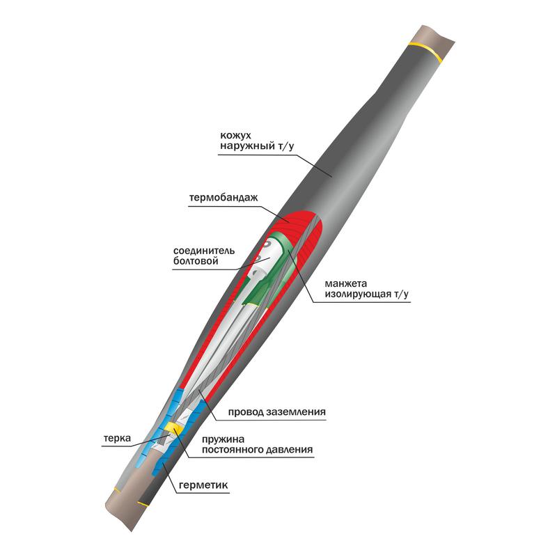Муфта кабельная соединительная марки 1ПСТб(тк)-4х(35-50) с болтовыми соединителями предназначена для соединения 4-х жильных силовых кабелей сечением 35, 50 кв.мм с пластмассовой изоляцией, с броней или без брони, на напряжение до 1 кВ включительно. Устанавливается непосредственно в грунте, а также в тоннелях, каналах, коллекторах, на открытом воздухе на эстакадах, кабельных полках и других кабельных сооружениях без ограничения по уровню прокладки. Эксплуатируется при температуре окружающей среды от -50°C до +50°C и относительной влажности до 98%. Соответствует требованиям ГОСТ 34839-2022 и ТУ 3599-012-31930690-2016. Прошла комплекс независимых испытаний в аккредитованных лабораториях, на основании которых выданы сертификаты соответствия требованиям ГОСТ, ТУ, пожарной и экологической безопасности. Монтируется на двух концах соединяемых кабелей путем термоусаживания деталей из модифицированного полимера с помощью газовой горелки или высокотемпературного фена. Универсальные болтовые соединители со срывными головками, входящие в комплект кабельной муфты, подходят для кабелей как с алюминиевыми, так и с медными жилами. Комплект заземления предусматривает крепление провода заземления к бронелентам соединяемых кабелей с применением роликовых пружин постоянного давления и контактных терок. Обладает необходимым уровнем устойчивости к воздействию агрессивных внешних факторов. Сочетает простоту монтажа и высокую эксплуатационную надежность. Срок службы - не менее 30 лет.