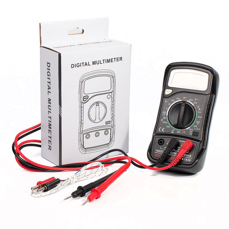 • Компактный цифровой мультиметр с основным набором функций и ручным выбором пределов измерений • Параметры измерений: • постоянное напряжение: 200 мВ – 600 В • переменное напряжение: 200 В – 600 В • постоянный ток: 2 мА – 10 А • сопротивление: 200 Ом – 2 МОм • температура: от -20 °С до +1000 °С • Основные функции и особенности: • ручной выбор пределов измерений • DATA HOLD, «прозвонка», диод-тест • транзисторный тест • Разрядность дисплея: 2000 отсчетов • Количество измерений в секунду: 2–3 • Индикация перегрузки, полярности, разряда батареи • Защитный кожух, подставка • Батарейка: 9 В тип «Крона», 1 шт. • Вес с батарейкой: 230 г • Габариты: 145х75х39 мм • В комплекте: мультиметр, измерительные щупы, термопара, батарейка, инструкция