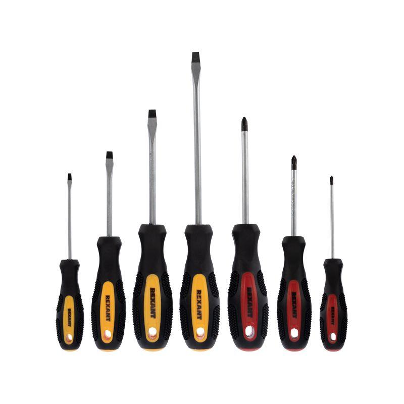 Набор отверток REXANT применяется для монтажа и демонтажа винтов, шурупов, саморезов и других крепежных изделий. Состоит из 7 отверток со шлицами SL и PH (крестовые и шлицевые) разных размеров. Стержень отверток изготовлен из высококачественной хромованадиевой стали и оснащен намагниченным наконечником. Эргономичные двухкомпонентные рукоятки отверток делают работу легкой и удобной. Количество отверток в наборе: 7 шт. Шлицевая SL3x75мм Шлицевая SL5x75мм Шлицевая SL6x100мм Шлицевая SL6x150мм Крестовая PH0x75мм Крестовая PH1x75мм Крестовая PH2x100мм