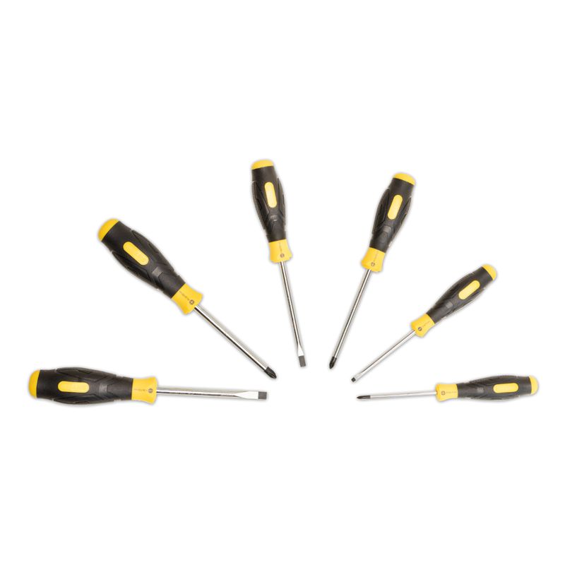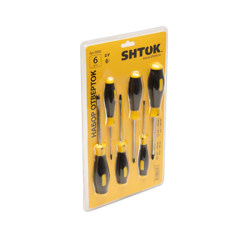 Набор отверток SHTOK 6 шт. блистер 09902 состоит из трех шлицевых (прямой шлиц) и трех крестовых (шлиц Phillips) отверток. Рабочая часть, изготовленная из хром-ванадиевой стали, увеличивает прочность износоустойчивость отверток. Набор поставляется в блистере. Все отвертки оснащены чернеными магнитными наконечниками для удобства монтажа в расположенных вертикально приборах. Особенности набора отверток SHTOK 09902 Удобство работы Черненый магнитный наконечник обеспечивает удобство монтажа в приборах, расположенных вертикально. Прочность Рабочая часть выполнена из хром-молибден-ванадиевой стали, что увеличивает прочность отверток.