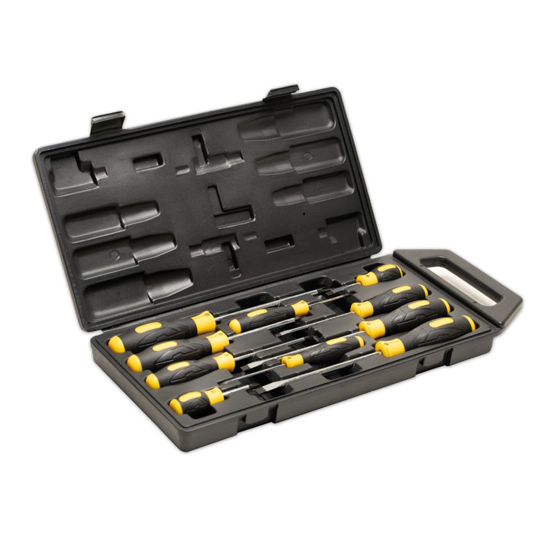 Набор отверток SHTOK 10 шт. кейс 09904 состоит из пяти шлицевых (прямой шлиц) и пяти крестовых (шлиц Phillips) отверток. Все отвертки оснащены магнитным наконечником. Удобные рукоятки обеспечивают надежный хват и точность работы. Отвертки поставляются в пластиковом кейсе. Рабочая часть из хром-ванадиевой стали обеспечивает прочность отверток. Особенности набора отверток SHTOK 09904 Удобство работы Черненый магнитный наконечник обеспечивает удобство монтажа в приборах, расположенных вертикально. Прочность Рабочая часть выполнена из хром-молибден-ванадиевой стали, что увеличивает прочность отверток.