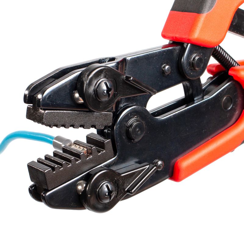 • Состав набора: • пресс-клещи CTB с механизмом быстрой смены матриц • матрицы МПК: 01/02/03/04/05 • прочная сумка на молнии • Совместимость: все матрицы МПК (КВТ) • Фиксация и высвобождение матриц нажатием на рычаги • Материал корпуса: 3-миллиметровая сталь • Усиленный трехшарнирный рычажный механизм • Удлиненные нескользящие рукоятки, позволяющие производить опрессовку двумя руками • Храповой механизм, обеспечивающий блокировку обратного хода до завершения полного цикла опрессовки • При работе требуют на 30% меньше усилий, чем аналогичный инструмент • Регулятор прижимного усилия матриц • Вес набора/инструмента: 1.05/0.62 кг • Длина инструмента: 260 мм • Габариты сумки: 280х125х50 мм