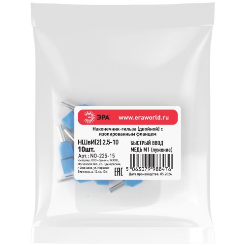 Наконечники-гильзы НШвИ(2) двойные состоят из медной луженой гильзы, один конец которой развальцован для облегчения ввода многожильного провода и изолирующей манжеты из полипропилена. Предназначены для использования с двумя проводниками: для оконцевания гибких многопроволочных медных проводников методом опрессовки для последующей фиксации в клемме или нулевой шине. Заменяют обязательный процесс облуживания многопроволочных медных проводов (типа ПВ-3, ПВС и т. п.). Применяются при сборке и монтаже электрощитового оборудования, щитов управления, квартирных или офисных распределительных щитков, при подключении к нулевым шинам. Наконечники-гильзы представлены в двух исполнениях для использования с одним и двумя проводниками. Особенности конструкции: • оническая форма внутренней части манжеты облегчает заведение гибкого многопроволочного проводника в наконечник, т.к. изготовлена по технологии «Easy-Entry»/«Быстрый ввод». • Изолирующая манжета служит ограничителем и одновременно дополнительно фиксирует провод по изоляции, предотвращая его излом. • Цветовая маркировка изолирующих манжет выполнена в соответствии с DIN 46228 часть 4, позволяет быстро подобрать нужный размер наконечника под сечение проводника. • Материал гильзы: медь марки М1, покрытая электролитическим лужением. • Материал манжеты: полипропилен с добавлением антипиренов, не поддерживающий горение.