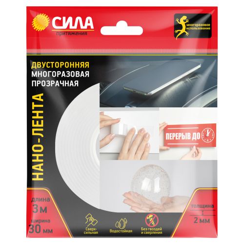 Двусторонняя многоразовая клейкая лента СИЛА (нано-скотч) – это инновационное средство крепления, которое обладает широкой сферой применения. Заменяет механический крепеж, фиксирует кухонные инструменты, ковровые покрытия, элементы декора, удлинители и хабы, картины, крючки, небольшие полки, интерьерные украшения, детали детских поделок и т.д. Лента покрыта большим количеством отверстий наноразмера, благодаря которым обладает сверхсильным сцеплением. Изготовлена из гелевого материала на акриловой основе. Легко клеится на любые поверхности: пластик, кафель, металл, керамика, дерево, мрамор, стекло. Крепится к любым не пористым поверхностям и легко снимается, не повреждая покрытие и не оставляя следов. Одно из важных преимуществ нано-ленты – устойчивость к влаге и сырости. Также лента отличается прочностью на разрыв, не теряет свойств при низких и высоких температурах, легко режется и может быть растянут и согнут в зависимости от потребностей. Клейкая лента не содержит токсичных веществ, утилизируется с пластиковыми отходами. Способ установки: очистите, обезжирьте и просушите поверхность; отрежьте нужное количество ленты; с небольшим усилием приклейте к поверхности; снимите защитную пленку; зафиксируйте предмет, нажимая на него. При повторном применении: отклейте ленту; промойте водой; просушите; приклейте на новую поверхность. Температура монтажа: от +10? до +30?