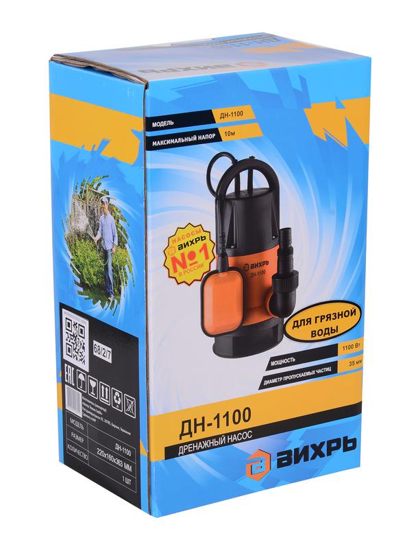 МОЩНОСТЬ, ВТ - 1100 ТИП - Центробежный, погружной, вертикальный НАПРЯЖЕНИЕ СЕТИ, В - 220 ЧАСТОТА, ГЦ - 50 МАКС. ТЕМПЕРАТУРА ВОДЫ, °C - 35 МАКС. ПРОИЗВОДИТЕЛЬНОСТЬ, Л/Ч - 15500 ГАБАРИТЫ, СМ - 40 х 20 х 10 ВЕС В УПАКОВКЕ - 6 кг ПИТАНИЕ - От электросети КОМПЛЕКТАЦИЯ - Дренажный насос – 1 шт; Пластиковый штуцер – 1 шт; Паспорт – 1 шт; Упаковка – 1 шт. МАТЕРИАЛ - Пластик ДИАМЕТР ВЫХОДНОГО ОТВЕРСТИЯ, ДЮЙМ - 1.5 ГЛУБИНА ПОГРУЖЕНИЯ, М - 8 ВЫСОТА НАПОРА, М - 10 КАЧЕСТВО ВОДЫ - Грязная ПОПЛАВКОВЫЙ ВЫКЛЮЧАТЕЛЬ - Внешний Дренажный насос ВИХРЬ ДН-1100 предназначен для откачивания и отведении воды и стоков с инородными примесями из различных водоёмов и резервуаров (котлованов, шахт, сливных ям и т.д). С их помощью можно выкачивать воду в случае подтопления жилых помещений и подвалов. Электродвигатель насоса асинхронный, однофазный с короткозамкнутым ротором. Максимальная глубина всасывания составляет не более 8 метров. Температура перекачиваемой жидкости должна быть от +1°C до +35°C. Не допускается работа дренажного насоса "в сухую" (без воды), попадание воздуха во всасывающую магистраль. От перегрузки насос защищает термопротектор, отключение происходит автоматически. При временной установке рекомендуются гибкие трубы, для постоянной установки рекомендуются жесткие трубы. Отличие модели ДН-1100 от ДН-1100Н в том, что корпус у ДН-1100 изготовлен из прочного пластика. При использовании данной модели допускается большой уровень загрязнённости воды, наибольший размер твёрдых частиц не должен превышать 35 мм. Насос оснащён внешним поплавковым выключателем, который отрегулирован на определённый уровень включения и отключения насоса. Необходимо удостовериться, что при минимальном уровне воды выключатель отключает насос. Убедитесь, что объем воды в пределах maх и min поля регулирования по отношению к количеству перекачиваемой воды и не требует от насоса более 20 включений в час.