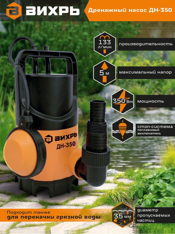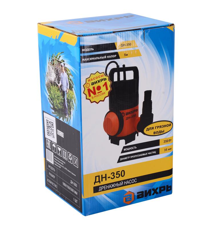 МОЩНОСТЬ, ВТ - 350 ТИП - Центробежный, погружной, вертикальный НАПРЯЖЕНИЕ СЕТИ, В - 220 ЧАСТОТА, ГЦ - 50 МАКС. ТЕМПЕРАТУРА ВОДЫ, °C - 35 МАКС. ПРОИЗВОДИТЕЛЬНОСТЬ, Л/Ч - 8000 ГАБАРИТЫ, СМ - 46 х 34 х 36 ВЕС В УПАКОВКЕ - 4 кг ПИТАНИЕ - От электросети КОМПЛЕКТАЦИЯ - Дренажный насос – 1 шт; Пластиковый штуцер – 1 шт; Паспорт – 1 шт; Упаковка – 1 шт. МАТЕРИАЛ - Пластик ДИАМЕТР ВЫХОДНОГО ОТВЕРСТИЯ, ДЮЙМ - 1.5 ГЛУБИНА ПОГРУЖЕНИЯ, М - 5 ВЫСОТА НАПОРА, М - 5 КАЧЕСТВО ВОДЫ - Грязная ПОПЛАВКОВЫЙ ВЫКЛЮЧАТЕЛЬ - Внешний Дренажный насос ВИХРЬ ДН-350 предназначен для откачивания и отведении воды и стоков с инородными примесями из различных водоёмов и резервуаров (котлованов, шахт, сливных ям и т.д). С их помощью можно выкачивать воду в случае подтопления жилых помещений и подвалов. Электродвигатель насоса асинхронный, однофазный с короткозамкнутым ротором. Корпус изготовлен из прочного пластика. Максимальная глубина всасывания составляет не более 8 метров. Температура перекачиваемой жидкости должна быть от +1°C до +35°C. Не допускается работа дренажного насоса "в сухую" (без воды), попадание воздуха во всасывающую магистраль. От перегрузки насос защищает термопротектор, отключение происходит автоматически. При временной установке рекомендуются гибкие трубы, для постоянной установки рекомендуются жесткие трубы. При использовании данной модели допускается большой уровень загрязнённости воды, наибольший размер твёрдых частиц не должен превышать 35 мм. Насос оснащён внешним поплавковым выключателем, который отрегулирован на определённый уровень включения и отключения насоса. Необходимо удостовериться, что при минимальном уровне воды выключатель отключает насос. Убедитесь, что объем воды в пределах maх и min поля регулирования по отношению к количеству перекачиваемой воды и не требует от насоса более 20 включений в час.