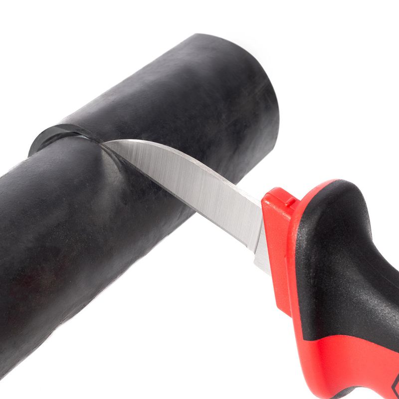 • Для работы под напряжением до 1000 В • Прямое лезвие из японской нержавеющей стали • Твердость лезвия HRC 51...53 • Изолированная рукоятка с упором для пальцев • Двухкомпонентная рукоятка из нескользящей термопластрезины • Защитный чехол для безопасного хранения и транспортировки • Ширина лезвия: 17 мм • Толщина обуха: 2 мм • Зачистка жил от окисной пленки, снятие оболочкии изоляции кабеля • Вес: 105 г • Длина: 204 мм